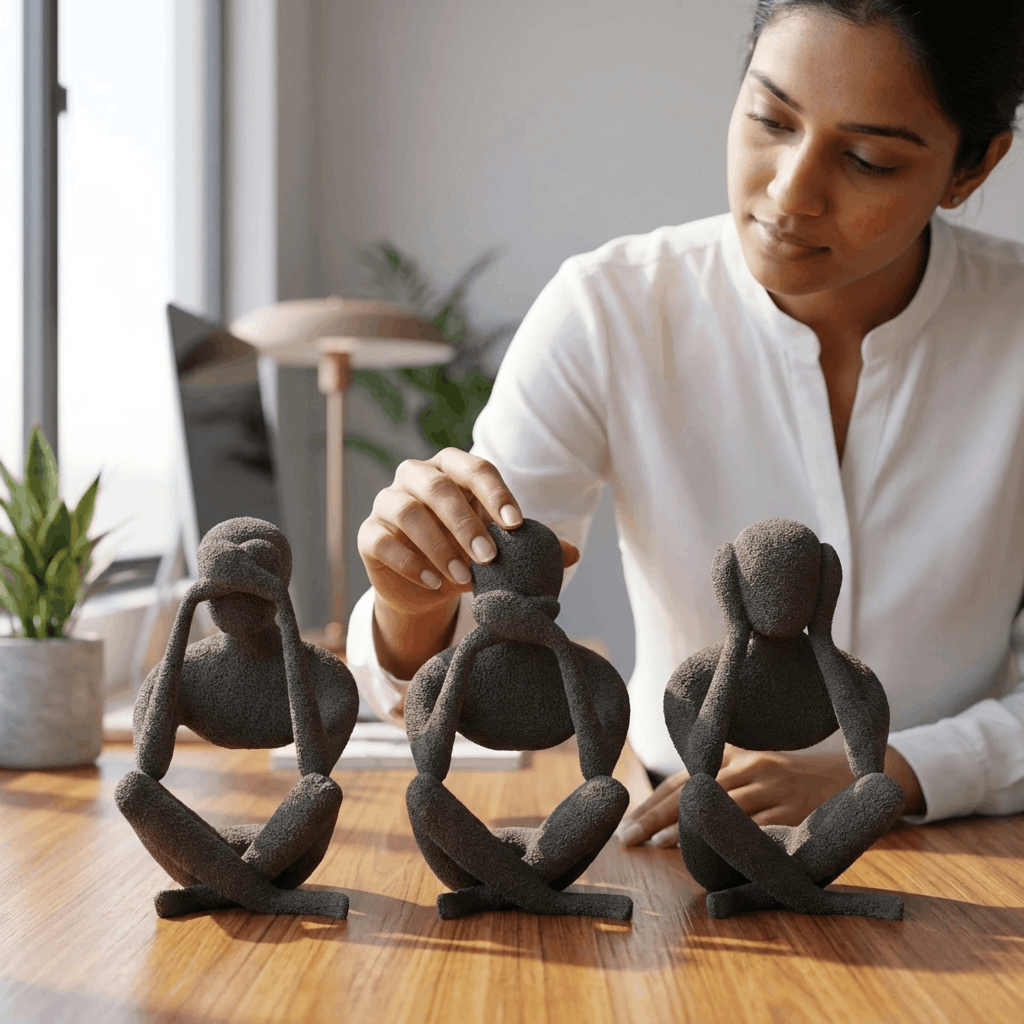 A contemporary 3D-printed take on the classic “See No Evil, Speak No Evil, Hear No Evil” proverb. This set of three textured, minimalist figures adds a touch of sophisticated philosophy to any desk, bookshelf, or modern living space.