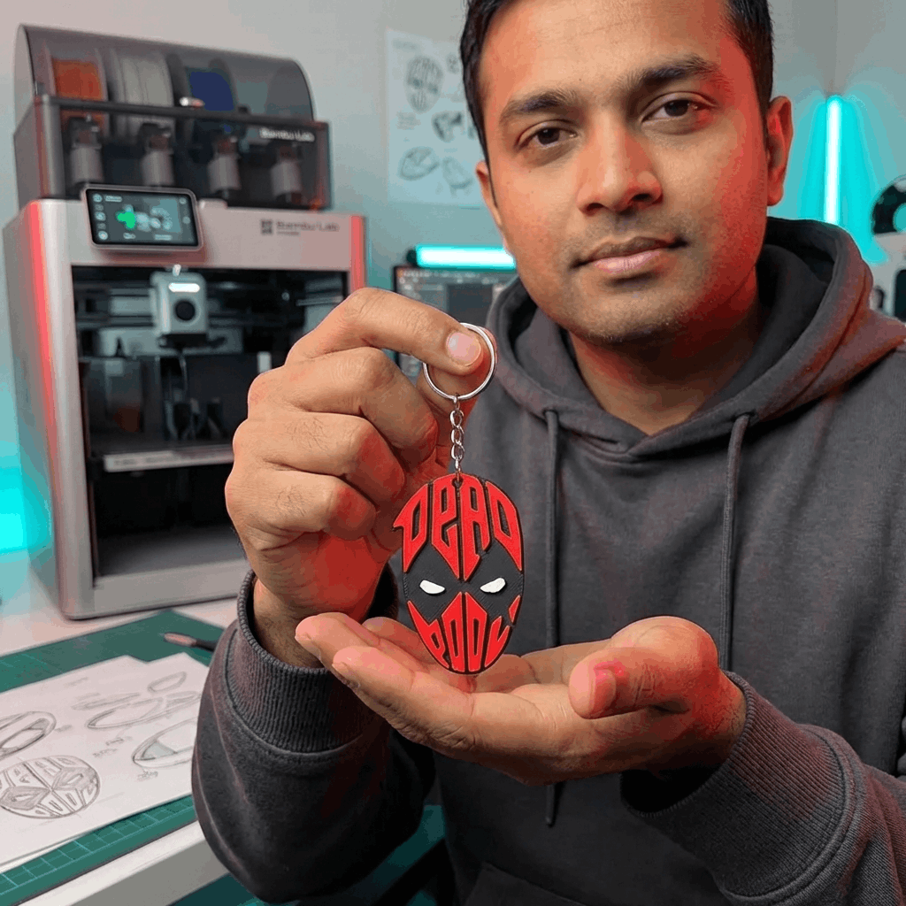 Add some sarcasm and style to your keys with this Deadpool-Style 3D Printed Keychain. Inspired by the iconic red-and-black mask design, this keychain is a must-have for superhero lovers and collectors.